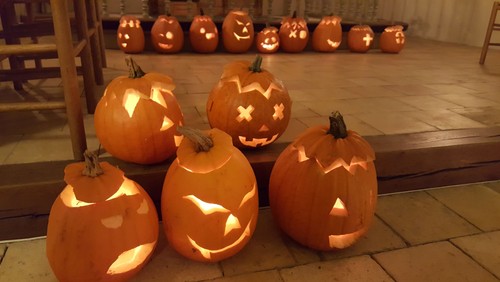 Der er pyntet op med græskarlamper lavet af minikonfirmander og konfirmander og det bliver uuuuu-hyggeligt hyggeligt.